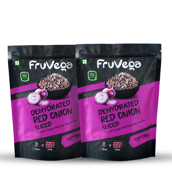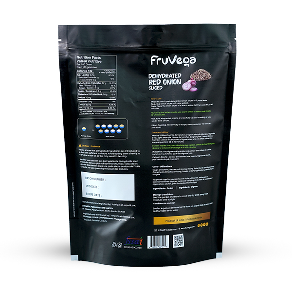 Simplify your cooking with Fruvega's Dehydrated Red Onion Slices. Using advanced dehydration technology, these slices retain the natural sweetness and slightly pungent flavor of fresh red onions. These slices rehydrate beautifully in liquids, becoming tender and flavorful, perfect for adding to curries, stews, soups, and casseroles. They can also be used dry in spice mixes or as a crunchy topping when toasted lightly. Enjoy the authentic taste and texture of red onions with unparalleled ease, reducing food waste and bringing nature's goodness conveniently to your kitchen.